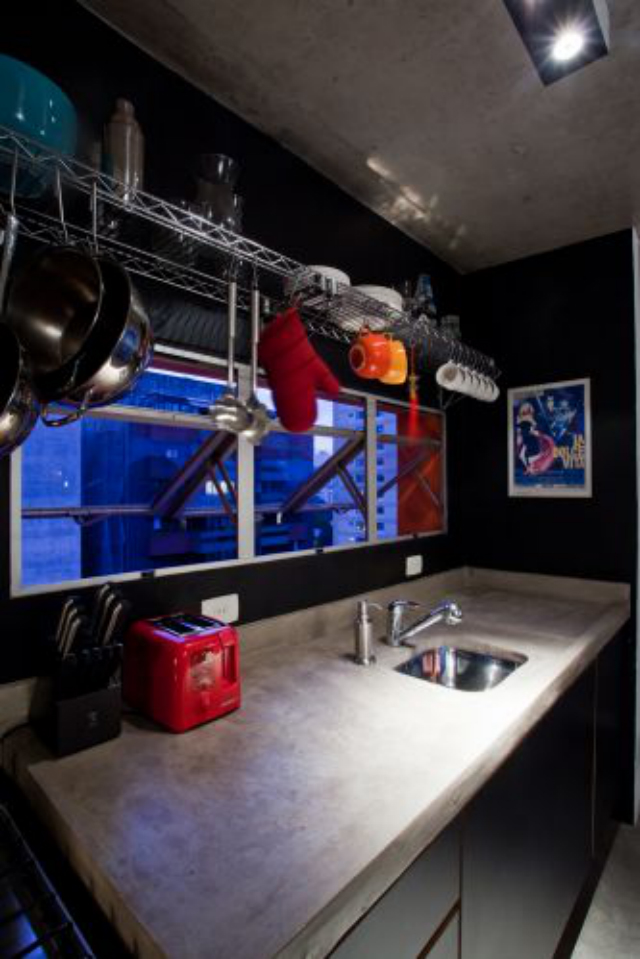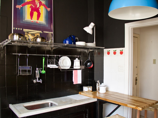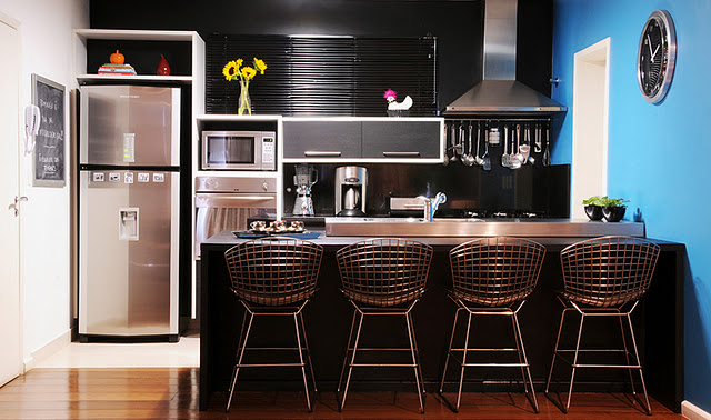 A imagem acima foi minha primeira inspiração, na verdade assisti um video do programa Decora que passa no GNT, e no episódio a transformação era exatamente dessa cozinha. Esse tipo de luminária eu já tinha na minha cozinha só que em amarelo, a idéia das prateleiras cromadas e quadro na parede foi o que eu super gostei, fora a parede preta é claro.