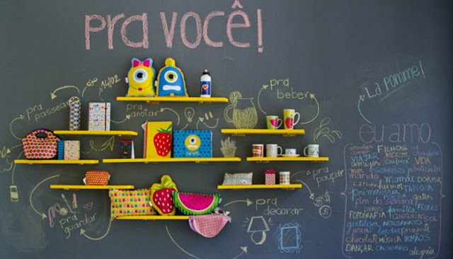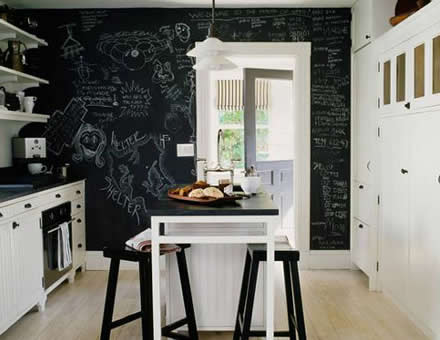 Outra coisa que acho super bacana são paredes lousa e na cozinha fica um charme e super útil também, da para anotar varias coisas como lembretes, lista de compras, receitas, etc.. e também já decora uma parede. Existe a tinta para lousa em verde escuro e preto, que podem ser usadas tanto na parede quanto em móveis, portas e outros em madeira. E também tem o adesivo que imita lousa que foi o que usei, esse pode ser usado até na geladeira.