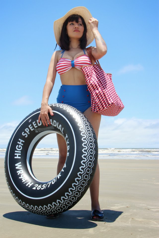 O look que usei nessa quinta é o tão polêmico desde o ano passado, biquíni cintura alta ou hot pants. Vintage surgiu por meados dos anos 40 e voltou de uns tampos para cá a ser usado nas praias, piscinas etc. A polêmica é que muitos entendedores de moda dizem achatar a silhueta, e ser terminantemente proibido para baixas de quadril mais largo.. Como eu odeio ditaduras e acho que moda “se te faz bem, que mau tem?”, aqui estou com um modelo de biquíni hot pants e com uma estampa navy, tem coisa mais amor e mais vintage?!!